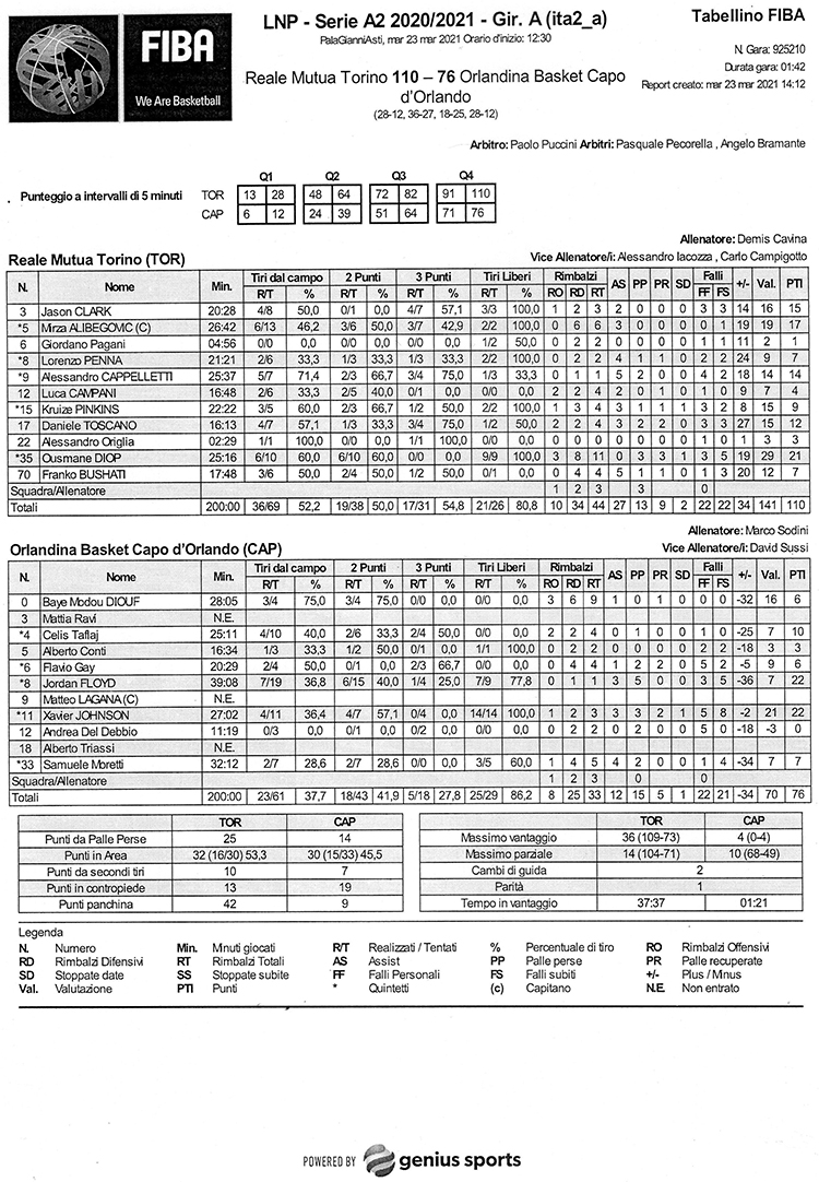 Torino, 23 Marzo 2021 Basket 4 Reale Mutua Torino-Orlandina Basket Capo d'Orlando - Pala Gianni Asti, Torino