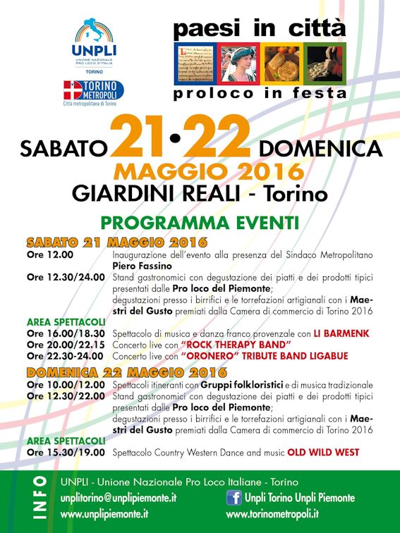 Fervono i preparativi nei Giardini Reali di Torino, dove sabato 21 e domenica 22 maggio le Pro Loco del territorio della Città Metropolitana di Torino saranno protagoniste dell’edizione 2016 della manifestazione “Paesi in città-Pro Loco in Festa”.