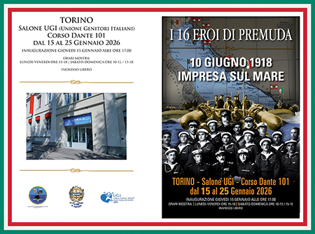 In occasione delle celebrazioni per i 130 anni del Gruppo ANMI (Associazione Nazionale Marinai d'Italia) di Torino e i 100 anni della Sede sul Po, tra le diverse iniziative, giovedì 15 gennaio apre la Mostra "I 16 eroi di Premuda" nel Salone di Casa UGI, corso Dante 101, Torino.